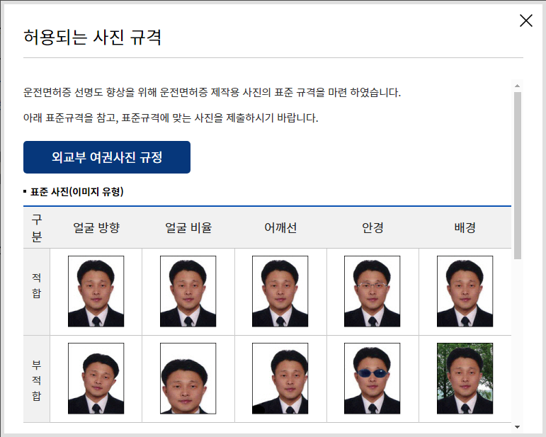- 사진 인화지에 인쇄된 사진만 허용(일반 종이 인화 사진은 면허 발급 시 해상도가 낮습니다)